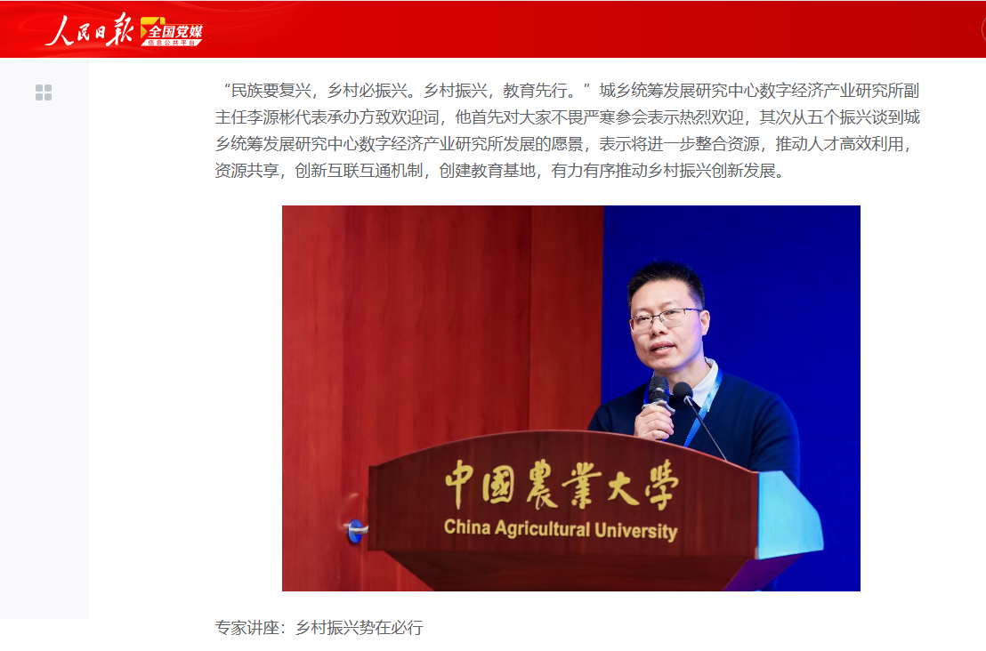 在社会服务实践中,他锚定乡村振兴,以中宣部城乡统筹发展研究中心数字经济产业研究所副主任身份,在全国乡村振兴创新发展基地(教育基地创建行动)研讨会上致欢迎词,围绕 “五个振兴” 提出教育赋能乡村振兴的融合路径,推动学校成为该行动核心承办单位,相关工作获人民日报、新华网等权威媒体报道,为高校服务乡村振兴提供可复制方案。