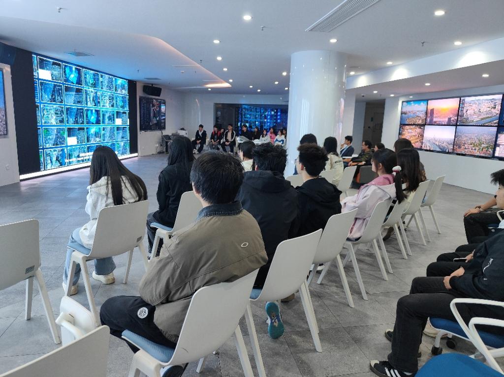 在企业相关负责人的热情接待下,师生们首先参观了见山科技的智慧管控中心。中心内,多屏联动的可视化系统清晰展示了企业在智慧城市、数字孪生、大数据分析等领域的核心技术成果与实际应用场景。企业技术人员围绕行业发展现状、技术迭代趋势、岗位能力需求等内容,为师生们进行了详细讲解,让大家直观感受到了人工智能、大数据技术在产业落地中的实际价值,也对行业前沿技术有了更深刻的认知。